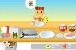 鼠标操作,按一下吐司就能烤吐司,接着请把吐司拿到调理餐盘上放好,按下蛋和热狗就可以煎了,等到煎好的时候请把火关掉,如果你做错了记得拿去垃圾桶丢掉啊!