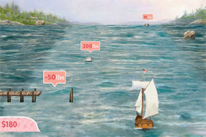 卡洛琳是一艘小船的船长,在海上迷失了方向,请你帮助她在航海路上拾起正确的货物和金币,并带她安全回到塞克斯港湾。