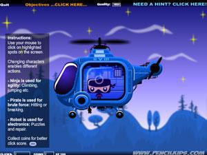 哇这战队也太厉害了,同时找来了忍者海盗以及机器人作为队员,当然每位的能力都不一样只有让他们各司其职才有办法解开这不算简单的推理益智游戏喔。不过,我们可不是三个人一起作战,其实只是变身能力很强而已,当你要爬上爬下或是躲避敌人时就得变身忍者,需要做粗活打人或是游泳之类的变身海盗就是你的最佳人选,至于计算机操作解开密码等要动脑的就交给机器人来办啦。使用鼠标点选变身随着不同的身份画面中会出现不同的事项可以执行,最后到底能不能找到被偷的宝石呢?你的解谜能力在这款游戏会受到很大的挑战。