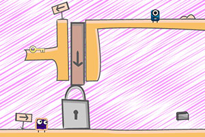 大眼先生:←→左右移动,↑跳跃,↓钻洞;小眼女士:AD左右移动,W跳跃,S钻洞。