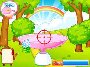 面包小人利用弹弓射水果、牛奶做果汁了,要对准果汁瓶射哦~