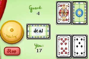 游戏介绍:游戏使用鼠标操作,先点左边的圆罩发牌,上面是对方的牌,下面是你的牌,旁边有点数显示,如果不到21点你可以冒险点deal继续发牌,发牌如果超过21点你就输了,如果没超过21点你点了stop,点数比对方多就赢了。来过一轮之后就可以点下面的king和queen来设计他们的造型哦~