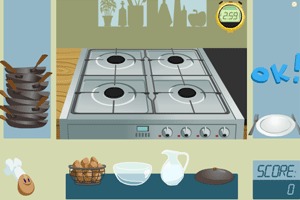 点击START SPILLET,先打三个鸡蛋在碗里加水搅拌至线满,点火放锅倒鸡蛋上盖,煎十秒钟放到右边的盘子里!