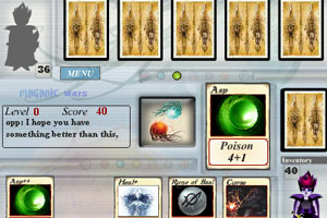 此款是个角色扮演的纸牌游戏线上版,一开始玩家会有五张牌每一回合你可以使用鼠标选牌,一张牌打出去后会抽一张牌回来,每张牌上都有不同的攻击点数,你的任务就是将对方的生命力降为0后即可过关,每一关所赢得的金钱还可以购买其他魔法工具。@@@鼠标操作