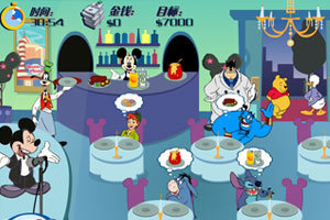 游戏介绍:米奇唱歌,唐老鸭迎宾,高飞服务员,米妮厨师,黛丝收银,这样的米奇餐厅生意肯定好,这不,灯神、王子、史迪仔等等大明星都到这来吃饭,快来经营有趣的米奇餐厅吧~