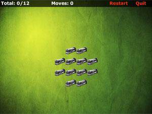 在游戏中,点击某个小车,其周围方向小车的颜色会变成相反颜色,所有小车颜色统一为黑色后即可进入下一关。