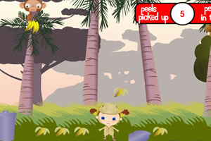 挑食的小猴太浪费粮食了,拿着香蕉只吃一口就扔掉,和小女孩一起帮助收拾这些水果垃圾,不要被天上掉下来的坚果砸到哦~