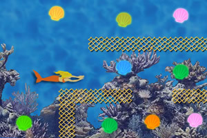 鼠标移动控制美人鱼移动收集彩贝。要快速收集彩贝加时间,不然等时间减为0游戏结束。