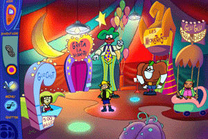 1:先进去,在高个子小丑脚下找到一瓶HE气,然后到卖糖果的小贩那里把钱给他(从物品里拖到他身上)。2:在三个糖果中选择粉色的那个,把粉色的那个对自己使用(拖到自己身上),会得到几块口香糖。3:再到卖票的那个妇女那里,地上有碎票,但是只能拼出一张完整的。拼好后在物品栏里把口香糖拖到票上,就会粘成一张完整的票,然后就去那个看怪物的地方,把票投进收票箱。4:进到里面,先去最里面的房间。先把插头插上,然后点那两个人,在这里要输入密码开琐,密码就在三个房间门的上方,开了后,他们会送你水晶球和吸铁石。5:然后去第二个房间,看见水缸里有个人,把底上的鱼竿捡起来,在物品栏里和吸铁石组合在一起,然后再进到里面,会看见氧气输送装置先把HE气接到最右边的管道(就是上方有个盖子开着的那个)然后把盖子盖上。6:把左下方的管子接起来.目标是让HE气通到较大的轮子上使它转动。记住轮子只要转动一次就可以。把口香糖粘在压缩装置上,点HE气瓶的开关处,看着气的流向转动其他的管子,有的是气刚通过就要换方向,把气导向压缩装置那里就行了。7:成功后缸里的人被吹胀了,用加了吸铁石的鱼竿把镜子吸上来。去第一个房间,看到长胡子的女人。拉下开关打开玻璃罩,把镜子给她看,她会吓跑并留下胡子,捡胡子后打开箱子,从里面的梯子下去。戴上胡子,从看门人身边经过。8:进到占卜女人的车里,把水晶球给她。